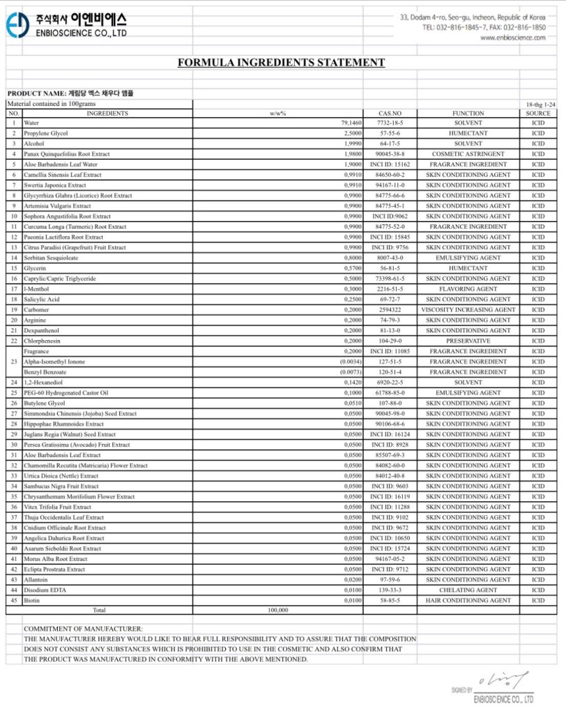 Dưới đây là bảng công bố thành phần của Ampoule Dưỡng Tóc GYERIMDANG :